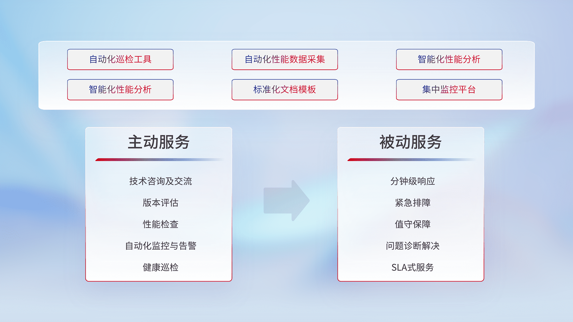 智能化工具和标准化文档,,保障服务质量,,,提供主动服务(包含技术咨询、、版本评估、、性能检查、、、自动化监控与告警、、健康巡检)和被动服务包含(分钟级响应、、紧急排障、、值守保障、、、问题诊断解决、、、、SLA服务)。。
